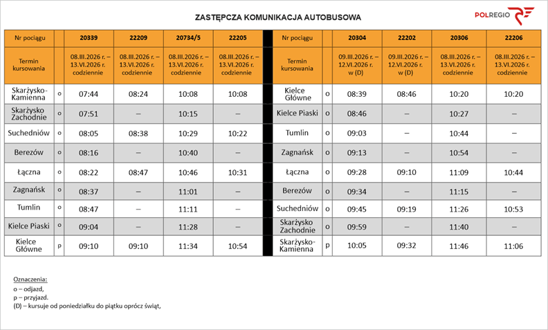 POLREGIO Świętokrzyski Zakład w Kielcach uprzejmie informuje, że od 8 marca 2026 r. do 13 czerwca 2026 r. na odcinku Kielce Gł. – Skarżysko-Kamienna – Kielce Gł., zostanie wprowadzona Zastępcza Komunikacja Autobusowa (ZKA) dla wybranych pociągów. Zastępcza Komunikacja Autobusowa zostaje wprowadzona w związku z przeprowadzaną przez zarządcę infrastruktury kolejowej PKP PLK modernizacją linii kolejowej nr 8.