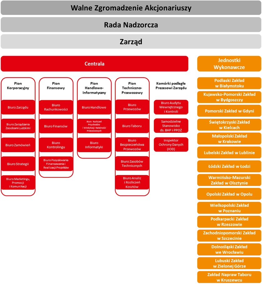 W strukturze organizacyjnej Spółki wyodrębnia się Centralę oraz jednostki wykonawcze, tj. 14 Zakładów, które realizują zadania w poszczególnych obszarach działalności przewozowej Spółki i Zakład Napraw Taboru w Kruszewcu.