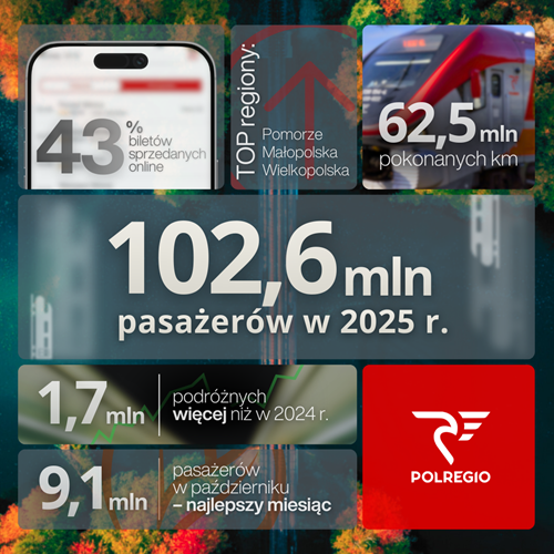 – 2025 rok zamykamy naprawdę bardzo dobrym wynikiem. Po raz kolejny liczba pasażerów korzystających z usług POLREGIO przekroczyła 100 milionów. To efekt wspólnego wysiłku wszystkich pracowników naszej spółki. Serdecznie za to dziękuję – mówi Aleksandra Grzywaczewska, p.o. prezesa Zarządu POLREGIO i dodaje: – Dziękuję również za okazane zaufanie – podróżnym, którzy wybrali naszą spółkę, a także współpracującym z nami samorządom województw.