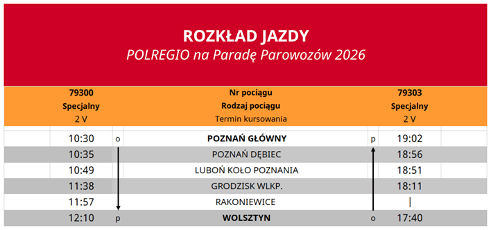 Na największą imprezę kolejową do Parowozowni Wolsztyn także w tym roku zapraszamy pociągiem specjalnym POLREGIO - będzie to niecodzienna okazja do przejażdżki wagonami, które zabiorą uczestników Parady Parowozów w sobotę 2 maja z peronu VII na stacji Poznań Gł. o godz. 10:30. Przedstawiamy rozkład jazdy pociągu do Wolsztyna i z powrotem. To połączenie, które warto wybrać planując swoją podróż na tegoroczną imprezę.