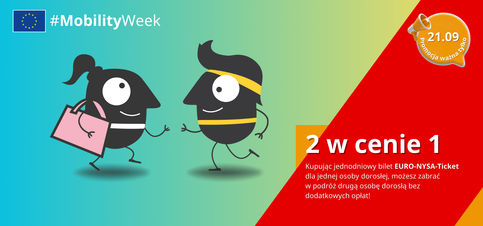 👉 Kupując jednodniowy bilet EURO-NYSA-Ticket dla jednej osoby dorosłej, możesz zabrać w podróż drugą osobę dorosłą bez dodatkowych opłat.