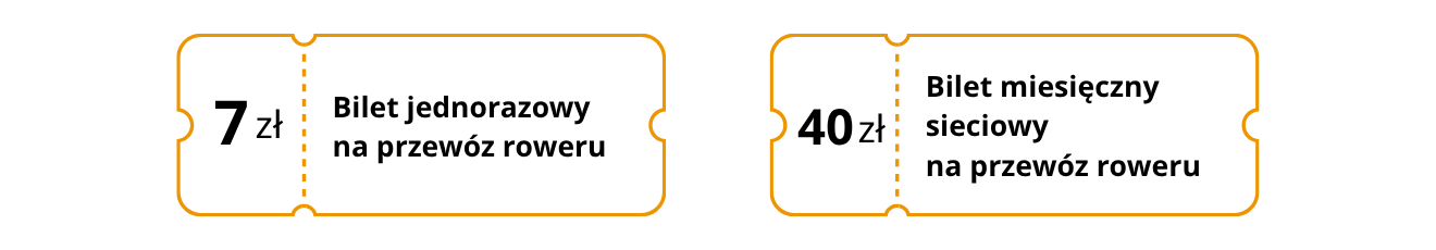 - Bilet na rower: przewóz roweru jest odpłatny – należy zakupić bilet jednorazowy lub miesięczny. Do biletu miesięcznego możesz pobrać bezpłatny kupon na rezerwację miejsca.