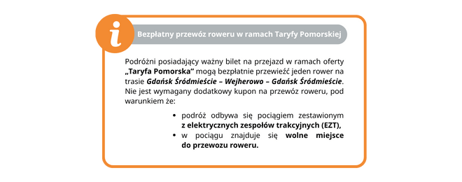Zgłoś się do obsługi pociągu przed wejściem na pokład, aby uzyskać zgodę i zakupić bilet. Nie dotyczy to podróżnych korzystających z ulg opisanych w regulaminach przewozowych POLREGIO i PKP SKM w Trójmieście.